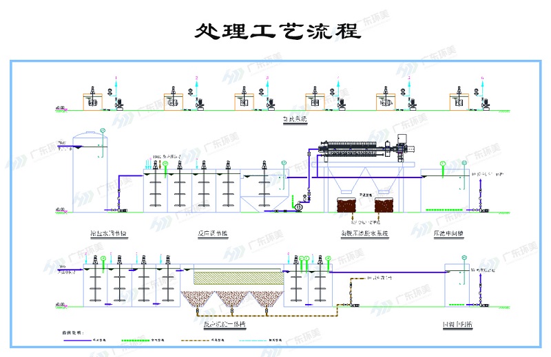 (2)高鹽廢水經充分均質均量后,廢水經泵提升進入一極物化處理系統,一極物化系統主要由一極反應槽、一極沉淀槽、壓濾機及壓濾水槽組成,廢水經泵提升后首先 進入一極反應槽,通過加藥系統往一極反應槽內投加液堿、氯化鈣、PAC及PAM,此時廢水中絕大多數鎂離子形成氫氧化鎂沉淀物從而被分離,廢水中大部分氟離子形成了氟化鈣沉淀物而被去除,反應所形成的細小懸浮物,經PAC與PAM反應作用后,細小懸浮物或膠體微粒互相吸附結合而成較大顆粒,并使得懸浮物從水中迅速分離,廢水經一極反應后,進入沉淀槽,如果當廢水反應形成的懸浮物量不大,不影響沉淀槽的正常固液分離時,廢水經沉淀槽固液分離后,污泥進入壓濾機進行脫水,壓濾機產生的泥餅委外處置,壓濾機產生的濾液自流進入壓濾水槽,沉淀槽清液則直接進入壓濾水槽;如果當廢水反應形成的懸浮物量很大,影響了沉淀槽的固液分離,沉淀槽中的泥水混合則通過泵全部提升至壓濾機進行固液分離,壓濾機產生的泥餅委外處置,壓濾機產生的濾液自流進入壓濾水槽。